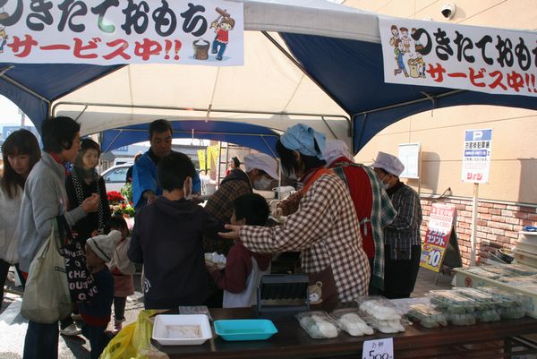 ショージの外では、ファームウチの仲間が餅つき実演とつきたてモチをご来店いただいたお客様にサービスさせていただきました。