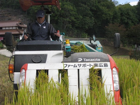 飼料用稲の刈り取り用コンバインが新しくなりました。このコンバインは、市内5法人で設立した「ファームサポート東広島」が購入し、飼料稲を作付けした法人が共同で利用することによってコスト削減を図りました。