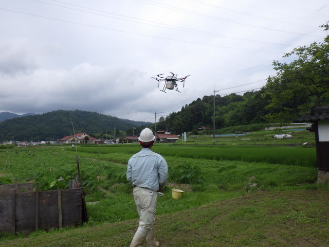 7月11日からいもち・紋枯れ病とウンカとカメムシ防除の目的でドローンを使って薬剤を散布しています。