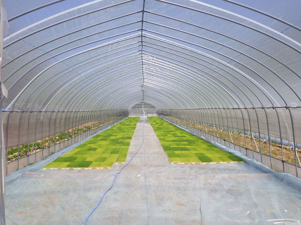 今年度最初の品種コシヒカリの苗床1840枚を育成ハウスに並べました。ここで18日間育成して今月末には植え付けます。28日には地元の小学校の児童も一緒に大きく育った苗で田植えを行います。