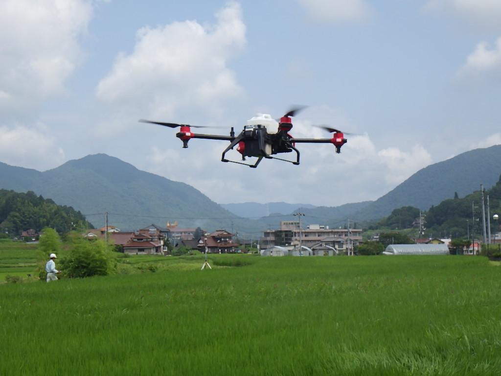 今年度初の農業用ドローンを使ってヒメノモチの殺虫殺菌の防除を行いました。昨年までは手動運転でドローン操作を行っていたものを,今年度からは事前測量を終えた田圃について,スマホ操作でGPSを利用してドローンの飛行を決定し行いました。