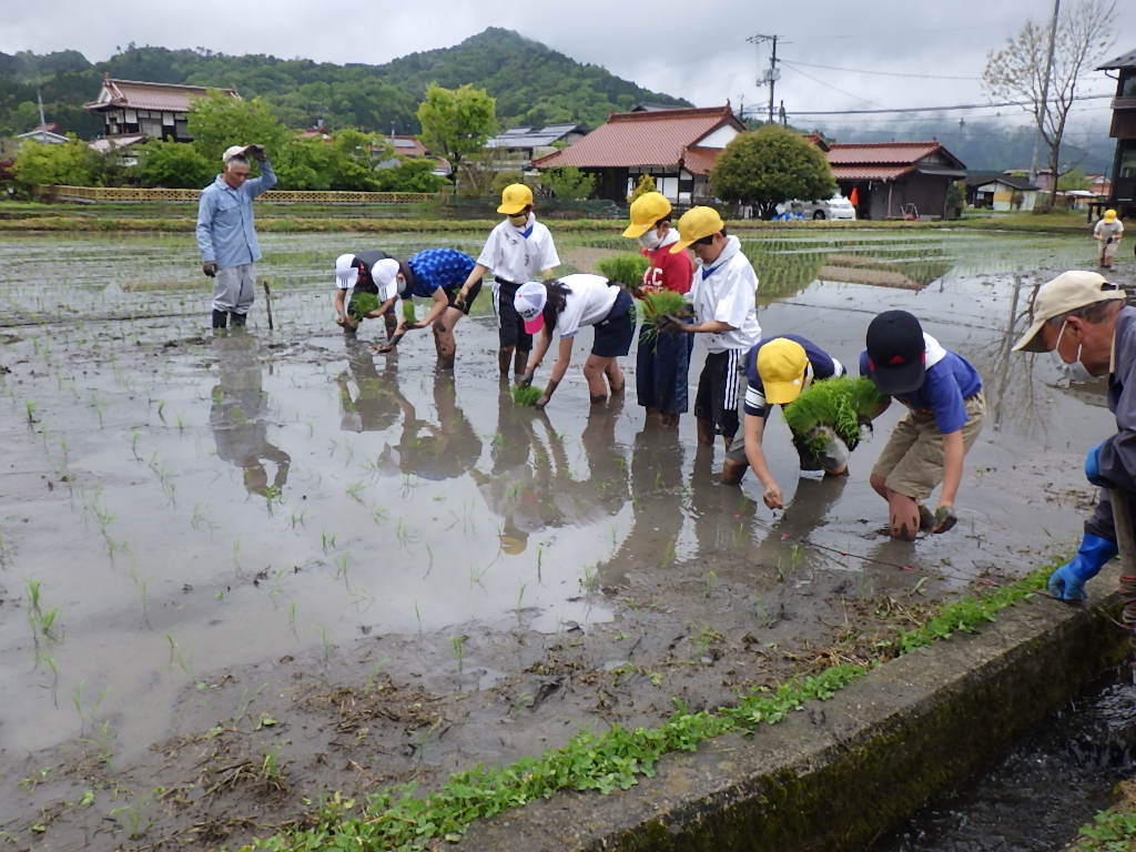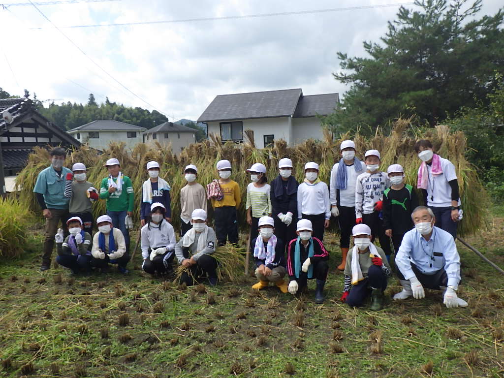 5年生の田植え体験では初め恐る恐る入っていた田圃で、渡される小さな苗を事前に引かれた筋に沿って植えていましたが,慣れてくるとふざけ合う児童も現れ賑やかに終えました。秋の収穫には安全な鎌の使い方や稲を揃えて置く大切さを学び,昔ながらの稲を束ねて干すハデ干し作業を体験しました。