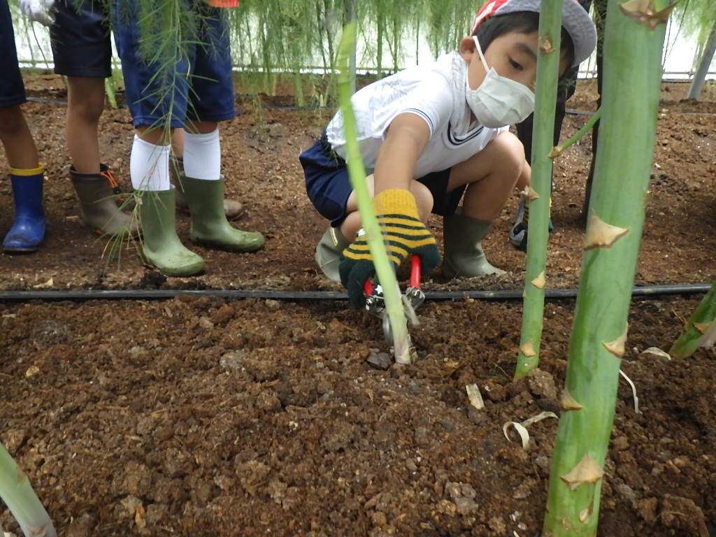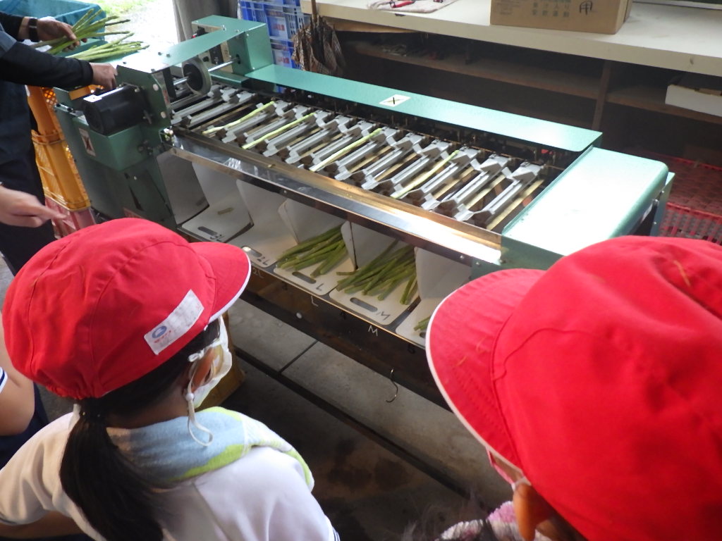 2年生のアスパラ収穫体験は温室内で基準の長さに達したモノを専用の鋏で切り収穫,その後自動で長さを揃え,大きさ別に分ける選別機械の様子を見学しました。