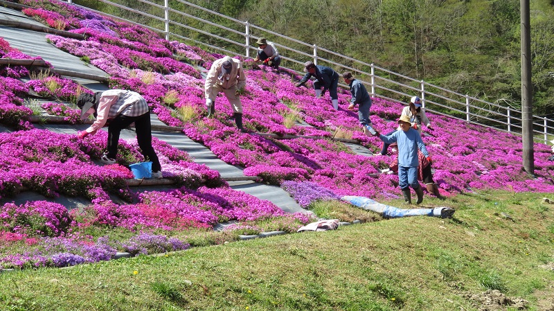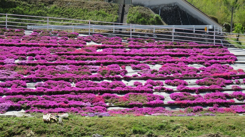 田植えを控えたファーム志和の田んぼの周りの様子です。山里の志和東内区は土手の広い田んぼの周りに芝桜を植えています。芝桜の管理は地元住民の協力を得て年間を通じて行っています。おかげでこのように見事に咲きました。早苗が田んぼに揃うまでの短い主役です。