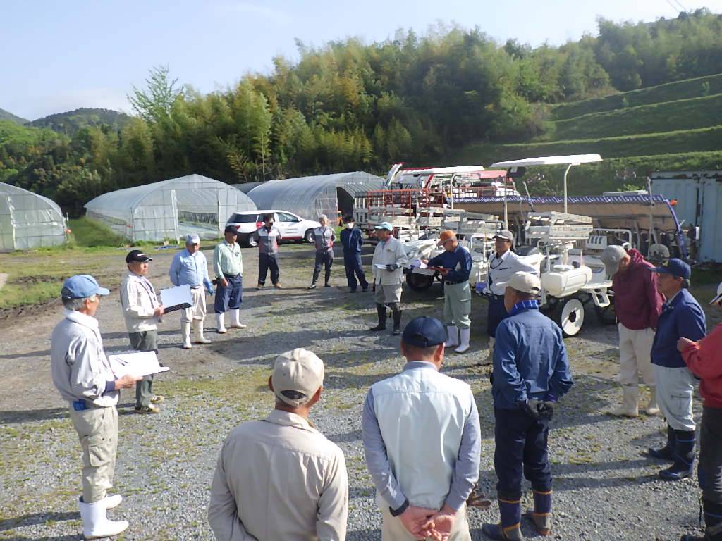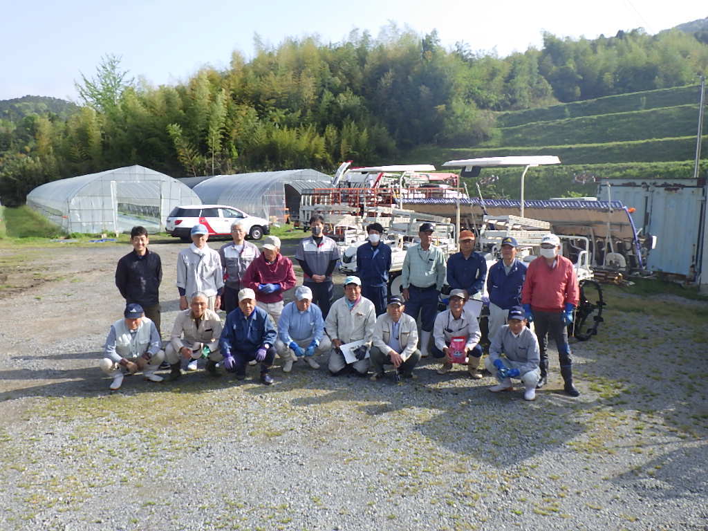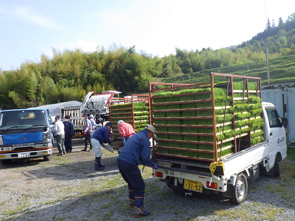 育苗から20日間,順調に育ったコシヒカリの苗を今日から3チームに分かれて植えていきます。始業前の作業員への作業手中の説明と事故防止の確認後に作業が始まりました。