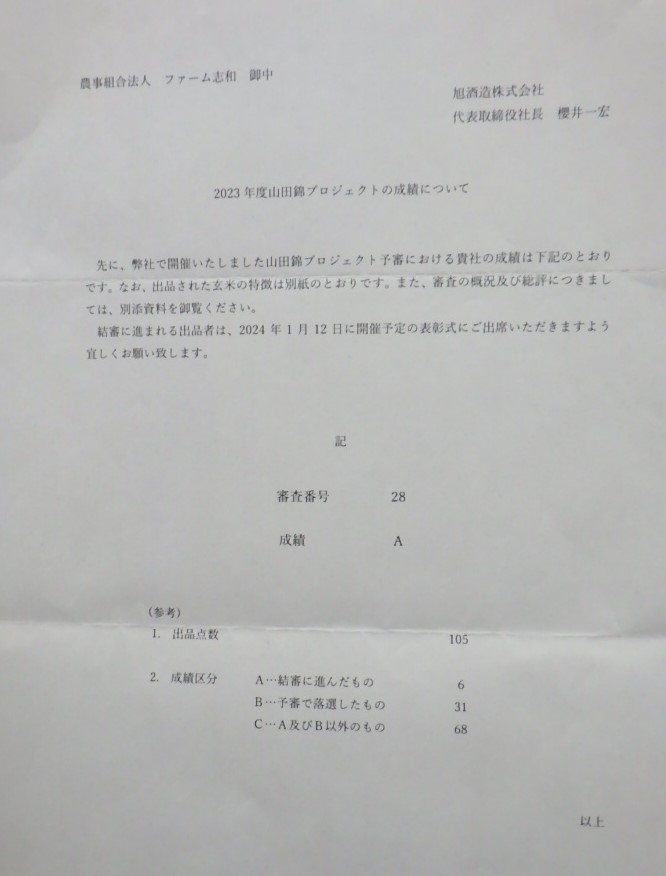 あの獺祭の旭酒造主催の『2023年年度山田錦プロジェクト』において当法人生産のお米が見事6位以内(参加数144名)に選ばれ,来年の1月12日開催(東京;帝国ホテル)の本選会に主催者側から髙木組合長への招待状が届きました。