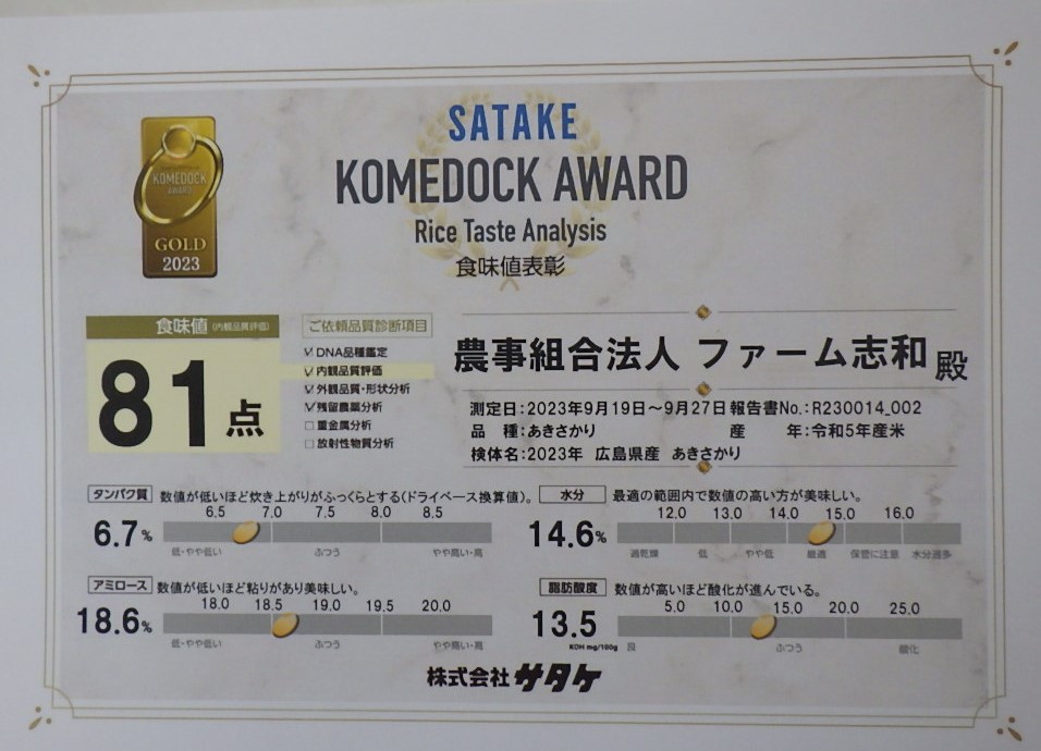 今年のあきさかりの食味検査を(株)サタケにお願いしたところ『81点』という高い評価を受け“美味しいお米である”との評価を頂きました。