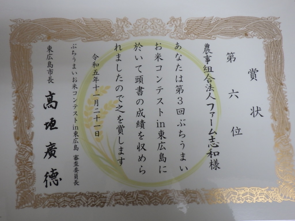 また,東広島市主催の『第3回ぶちうまお米コンテスト』で当法人のあきさかりが6位(本選は5位まで)で,ここでも高い評価を受けることが出来ました。
